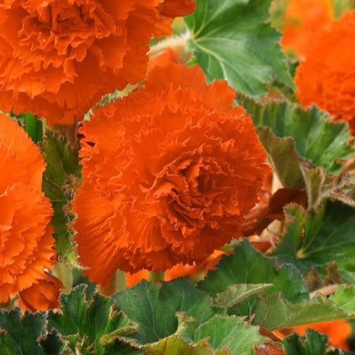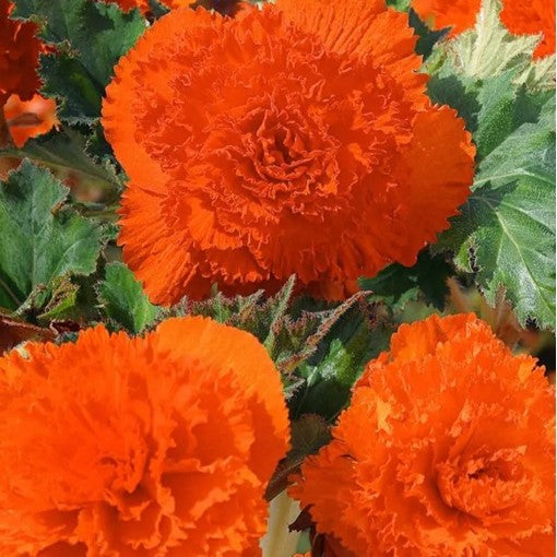 The Begonia 'Fimbriata Salmon' is a unique plant with ruffled double flowers in vibrant orange, blooming from June onwards. Ideal for partially shaded areas with well-drained, nutrient-rich soil. Grows up to 30 cm in height and width, creating a full and colourful display.