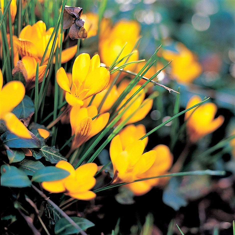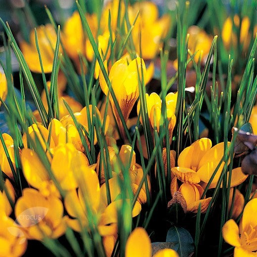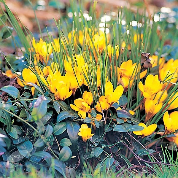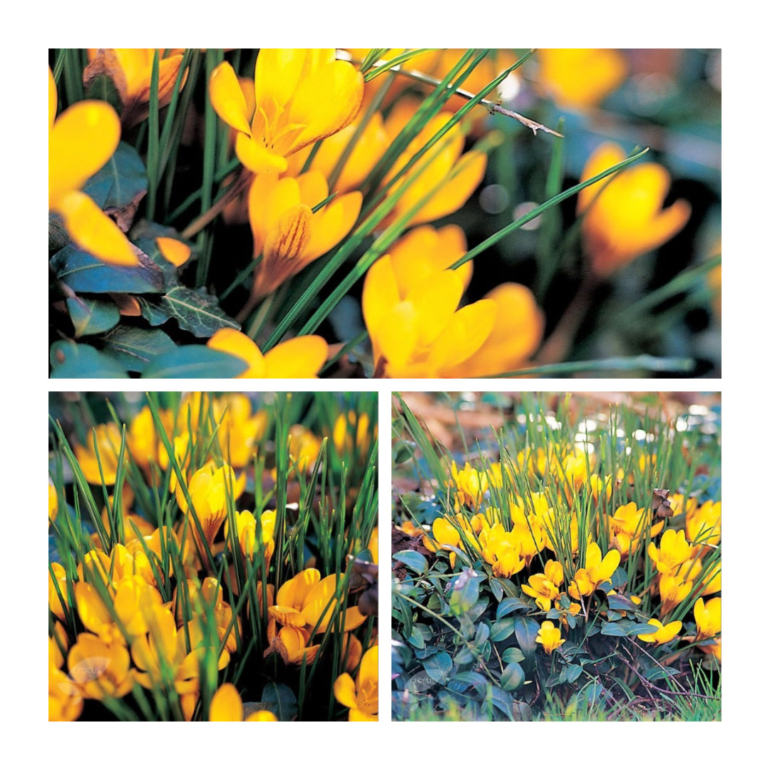A yellow goblet shaped Species crocus, its outer petals striped purple. They naturalise superbly and are very low maintenance.