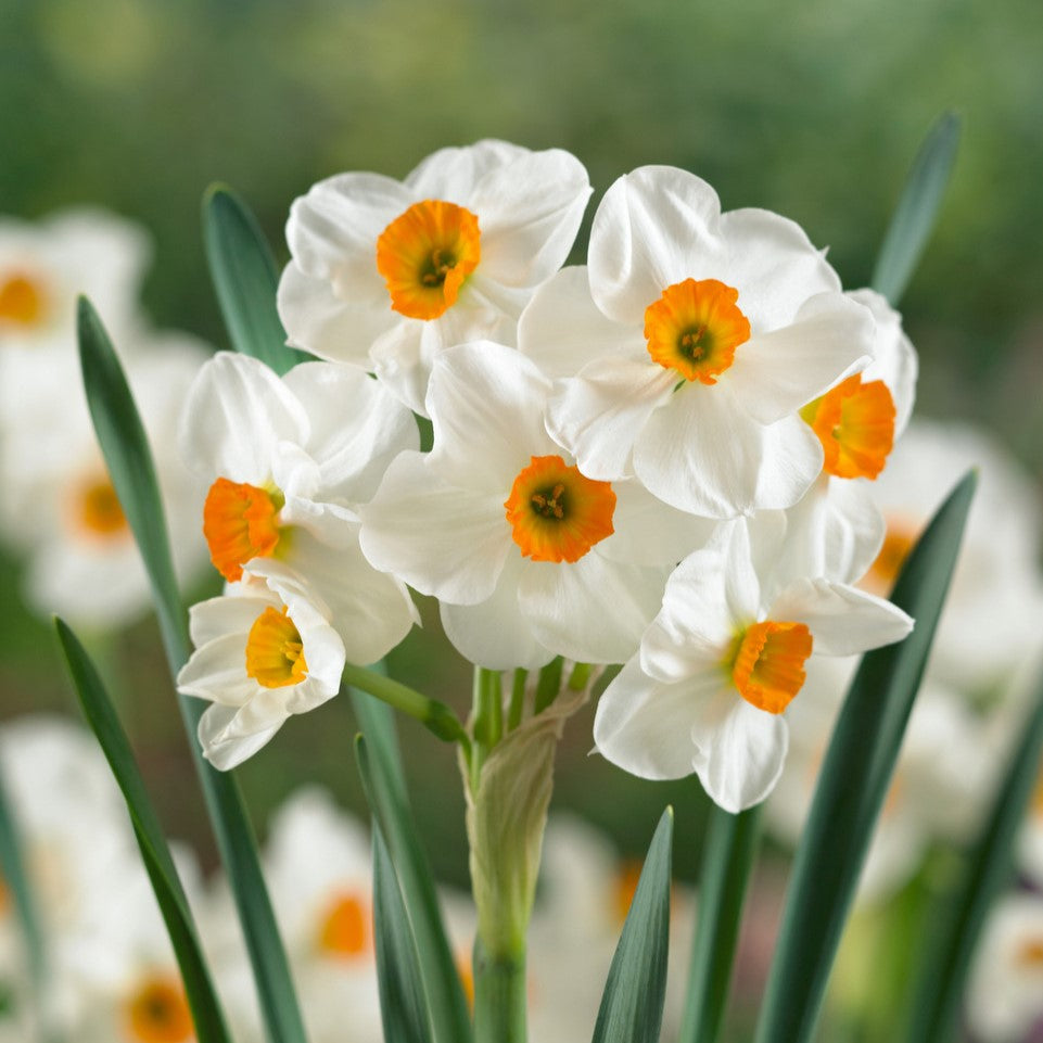 The pure white petals contrast brilliantly with the bright orange cup. Narcissus Geranium is multi-headed and fragrant a good strong narcissus, planted en masse look fabulous. Be aware though, if planting bulbs in a grassed area, make sure that the leaves have died down before mowing or strimming.