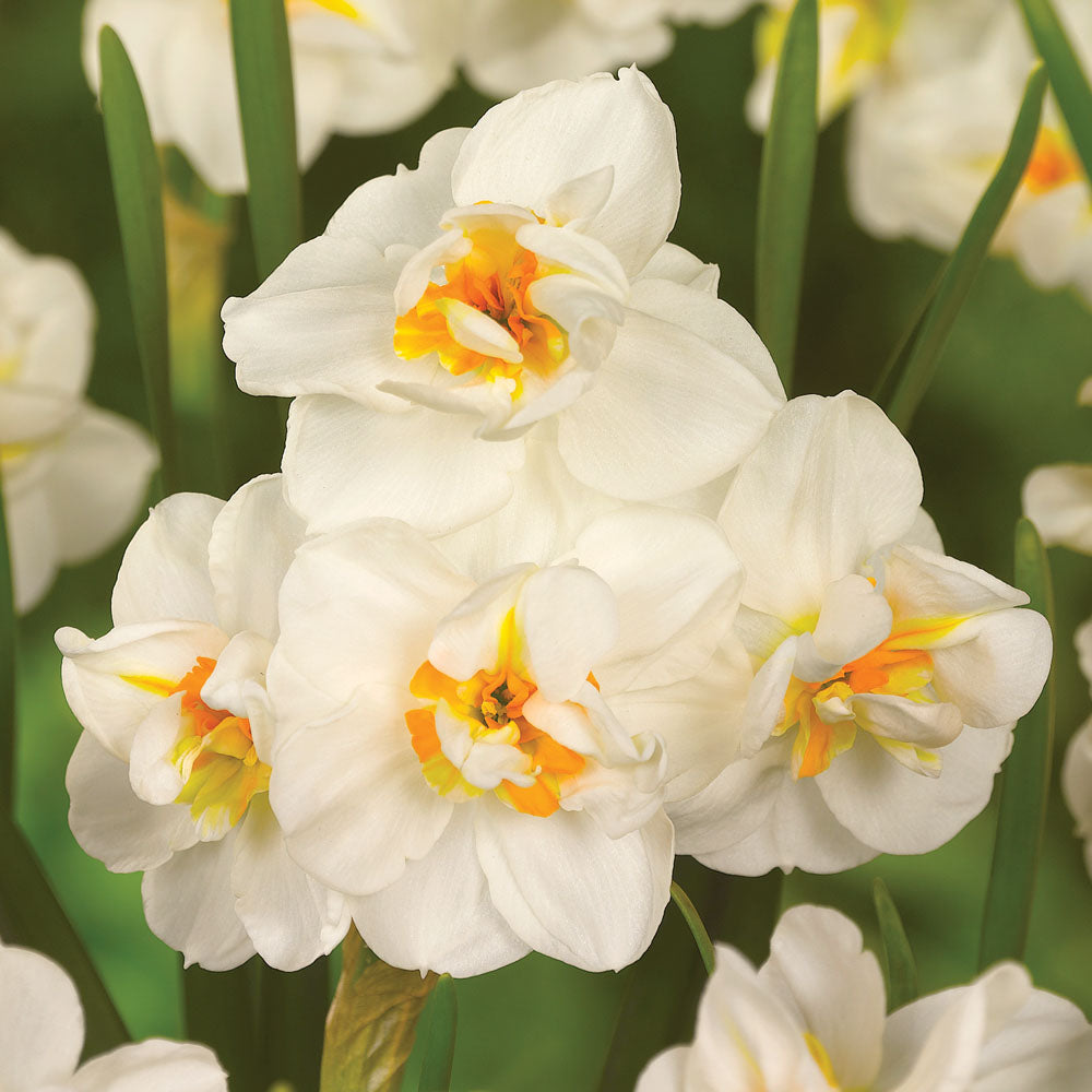 This excellent narcissus produces stunning double flowers with White and Orange/Red centre. Very fragrant, this Daffodil is wonderful, planted in the front of borders or in containers. The double heads also make great cut flowers.