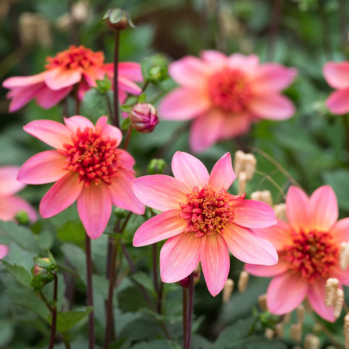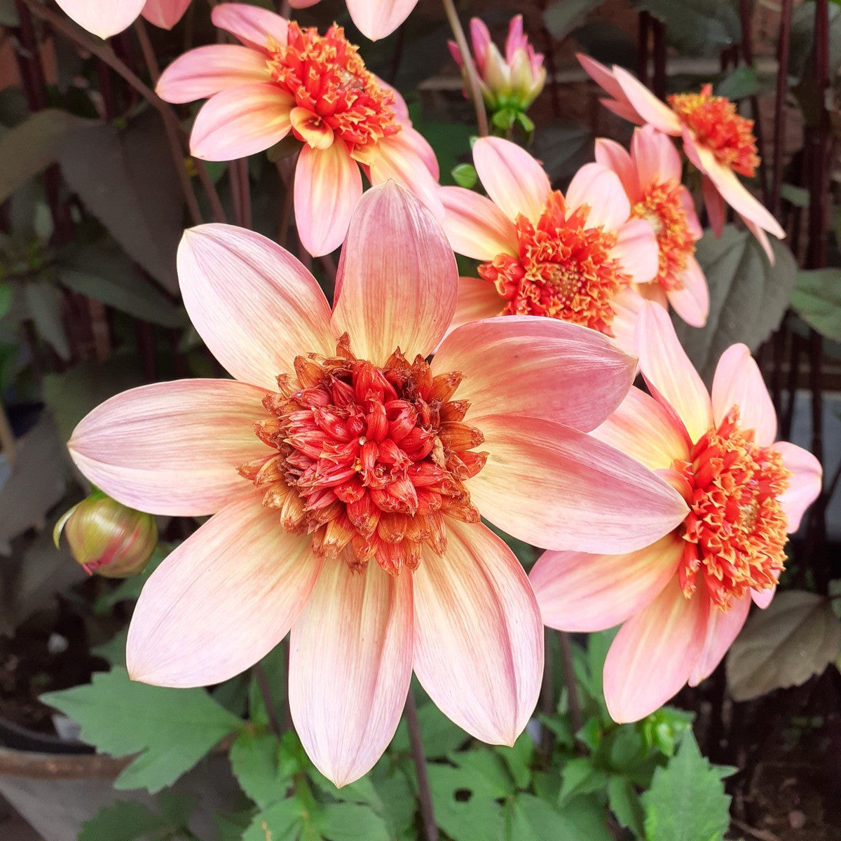 Introduce some tangy citrus tones to your garden with Dahlia 'Totally Tangerine' This eye-catching flower features coral pink petals and a neon orange ruffle, making it a lively addition to any border. With a long blooming season, expect a vibrant performance from this jaunty dahlia.