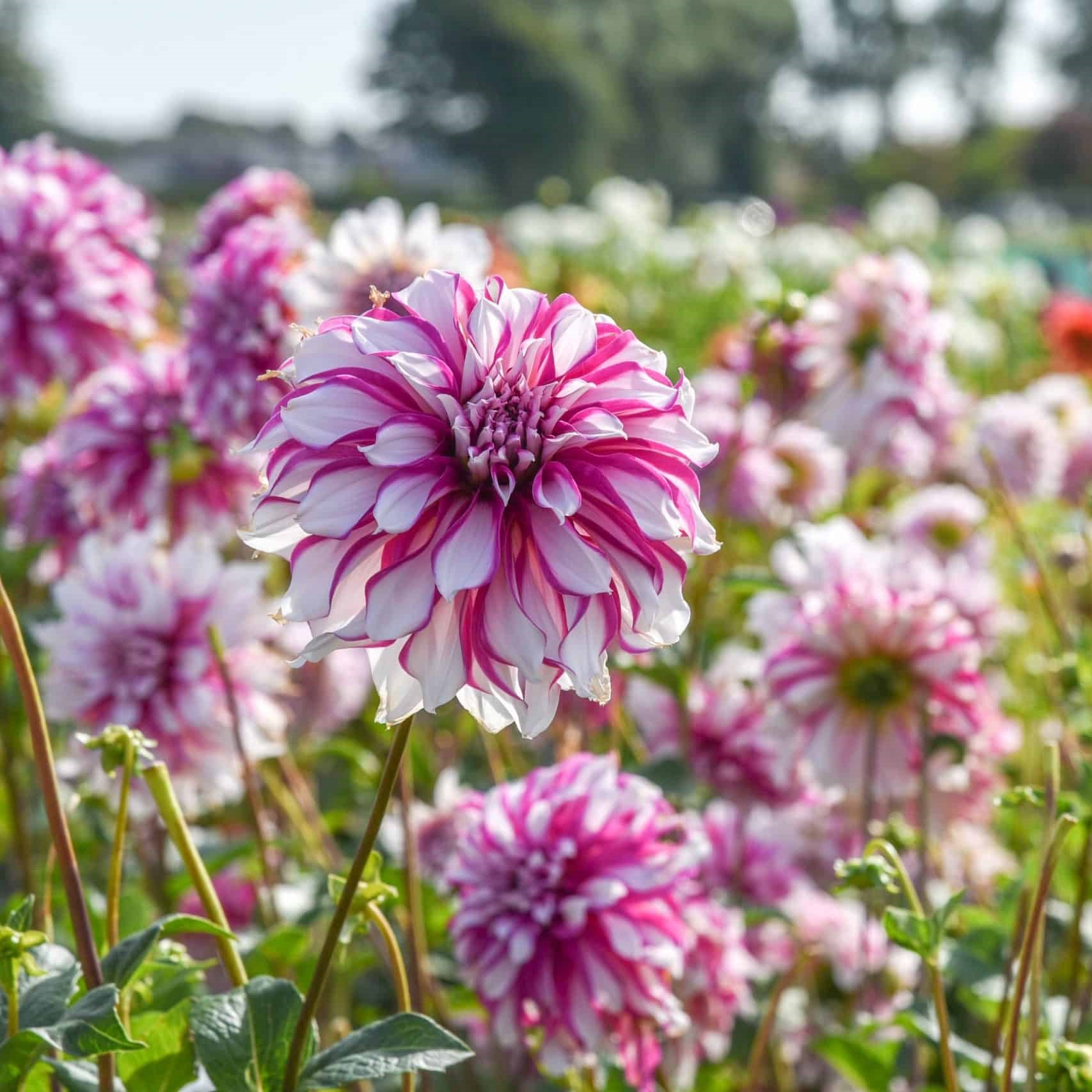 Dahlia Radegast is a majestic decorative dahlia that boasts eye-catching, bi-coloured blooms in vibrant magenta-pink and elegant white. With its tall, sturdy stems and lush foliage, it adds structure and height to any garden border. Blooming from midsummer to the first frost, it offers a long season of vibrant colour.