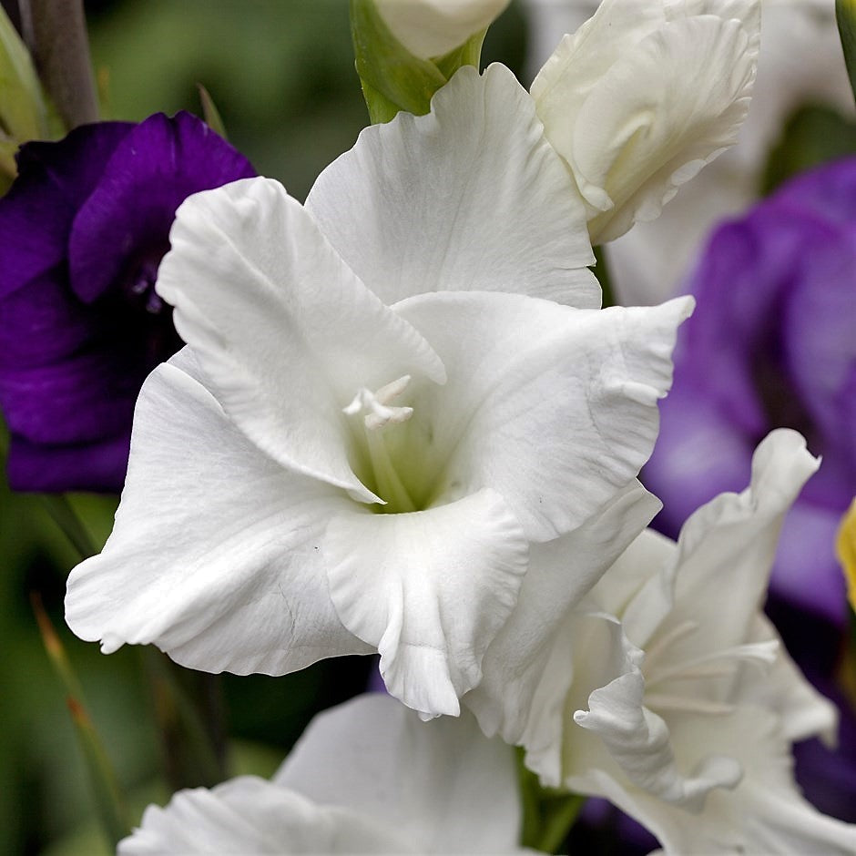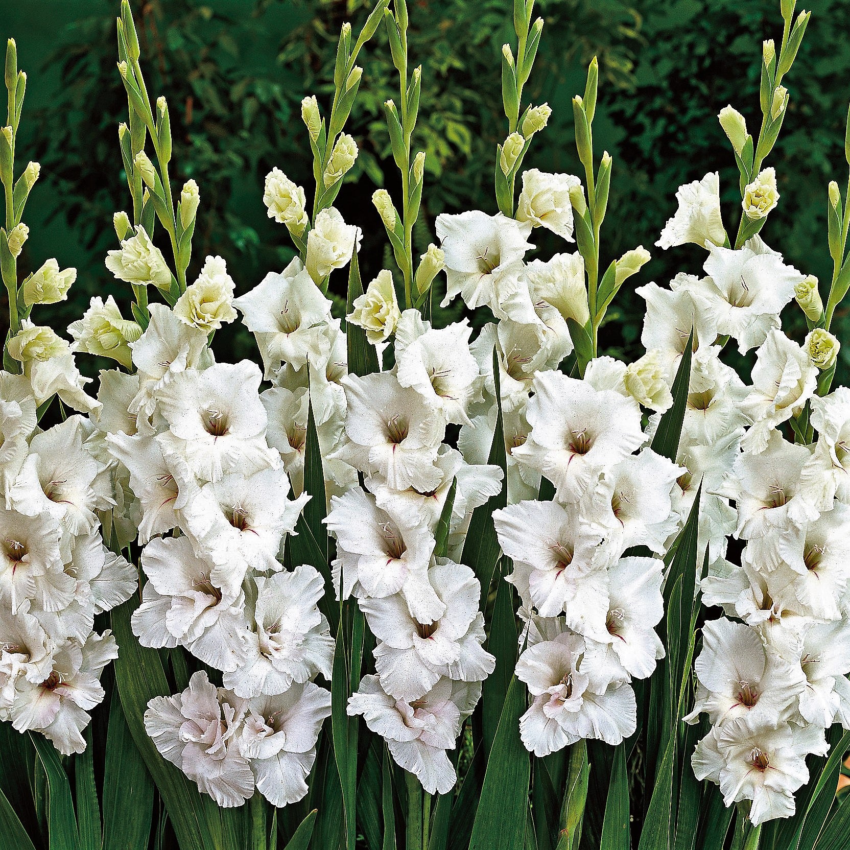 Gladioli White Prosperity have beautiful pure white, ruffled florets. Brilliant for a general display but also making lovely cut flowers Gladioli are a really versatile and easy to grow.