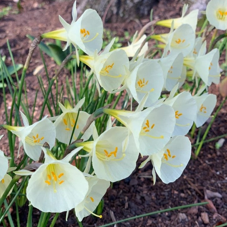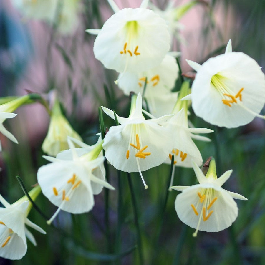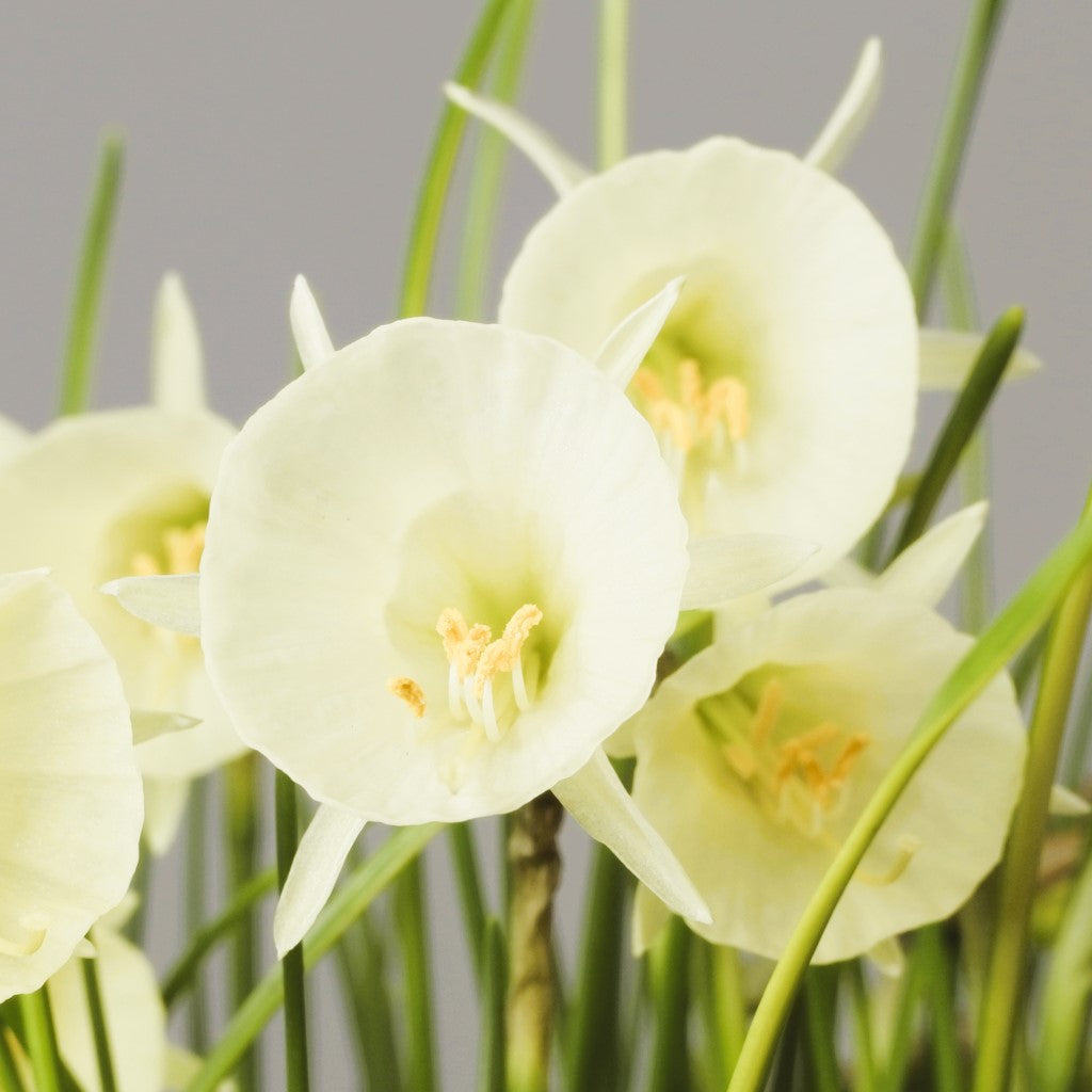 Narcissus Bulbocodium Arctic Bells, known as Hoop Petticoat, presents elegant flowers that open in a soft cream-yellow, gradually maturing to a refined ivory-white. The petals are slender and form a distinctive star shape, accentuating the delicate, dainty character of each bloom.