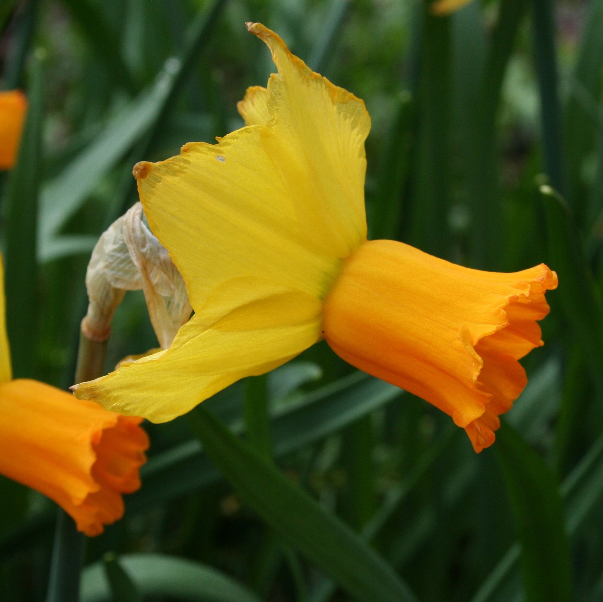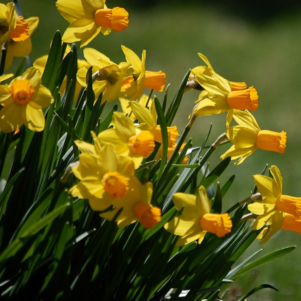 Daffodil Jetfire. Dwarf yellow Daffodil with striking orange trumpet. Ideal for the rockery, in tubs or naturalising. Be aware though, if planting bulbs in a grassed area, make sure that the leaves have died down before mowing or strimming.