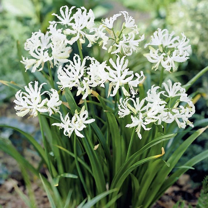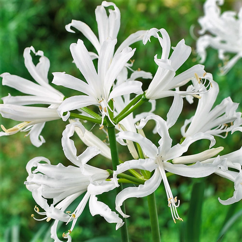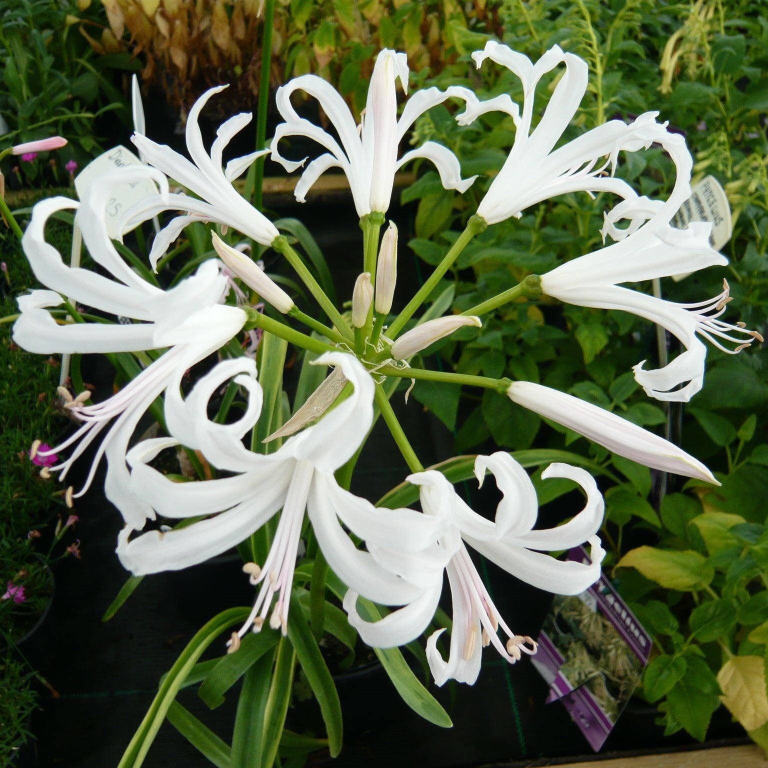 This exotic-looking perennial is a welcome breath of fresh air for a waning garden at the end of summer, when most plants are past their best. The delicate Nerine Bowdenii Alba (also known as the Guernsey Lily) provides snow white curled petals with wavy edges, standing on stiff upright stems and accompanied by beams of rich green foliage. Originating from the hot plains of South Africa, Nerine Bowdenii feels most at home in a freely draining soil in full sun.