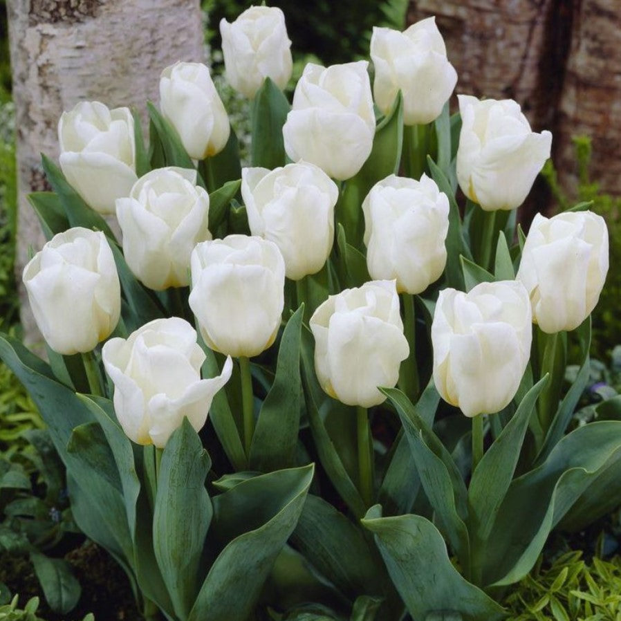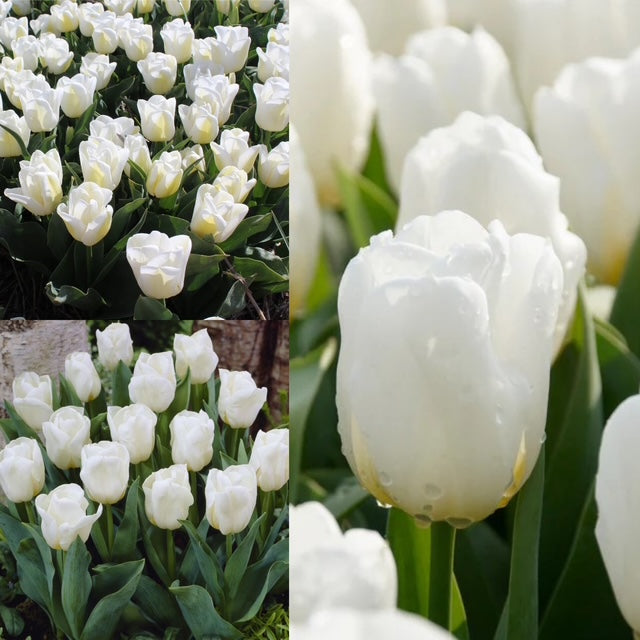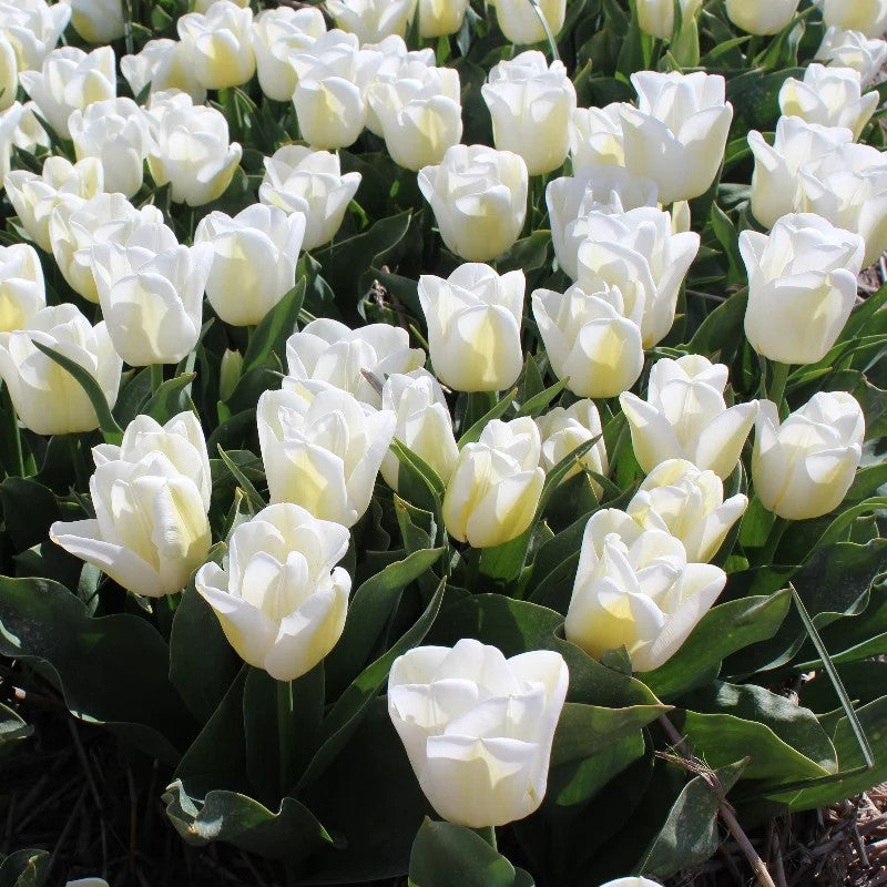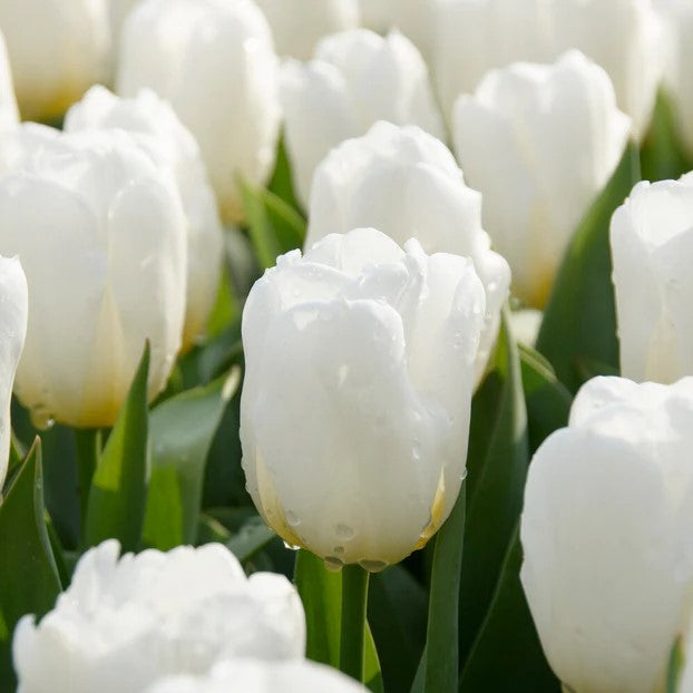 Tulip 'Calgary' features pristine white petals subtly enhanced with cream blushes and delicate green veining at the base, complemented by softly flushed yellow stamens at its centre.