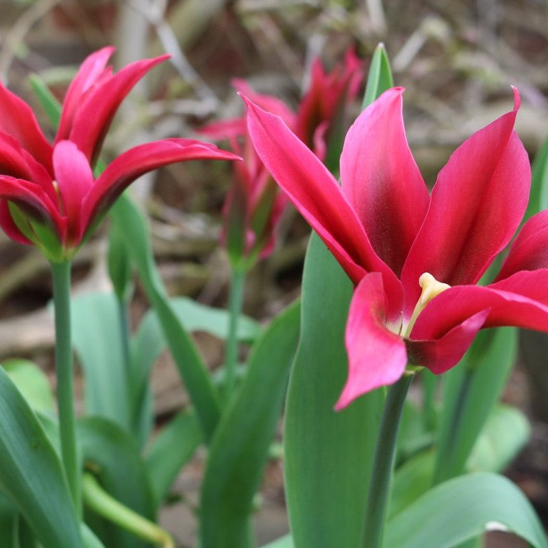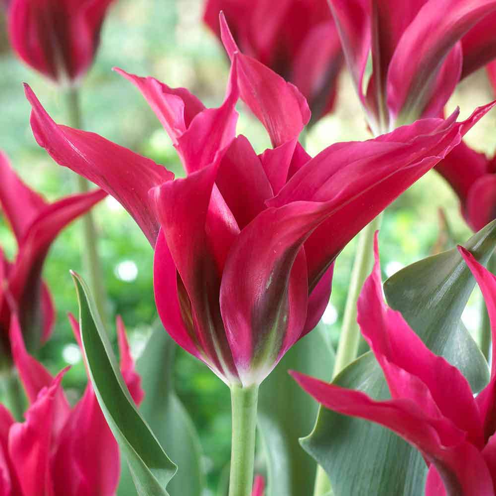 A beautifully viridiflora tulip that has a delightful lily-flowered shape. The deep pinky-red petals are lightly flushed with green and have pointy tips that flare outwards at the top of the flower. It is highly prized for its unusual colouring and slender petalled, spidery blooms that have a really interesting silhouette.