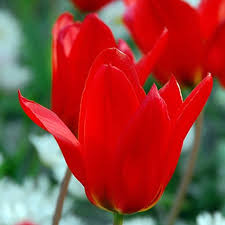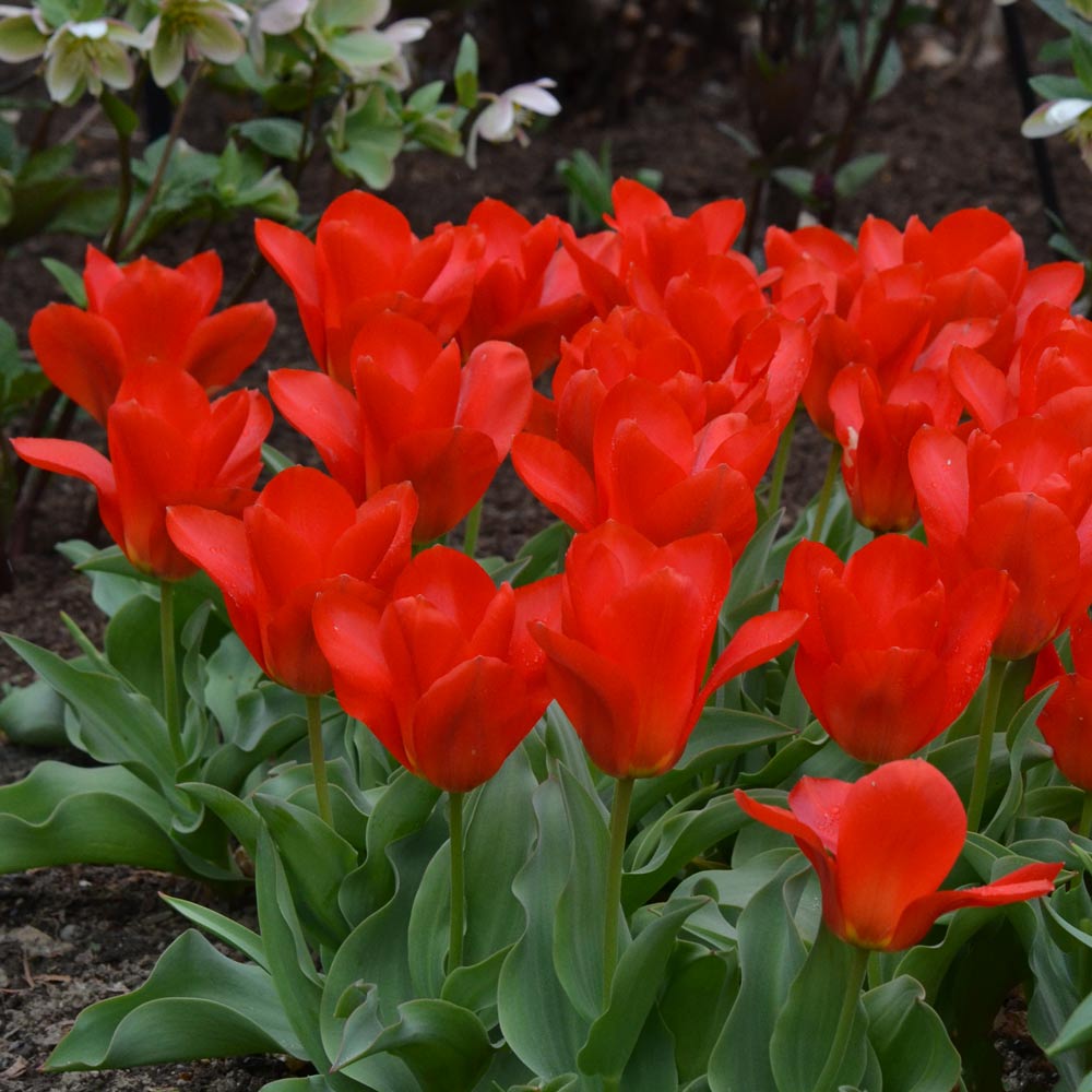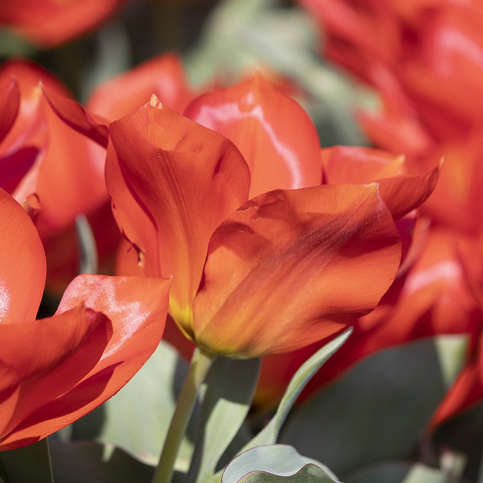 This tulip features vibrant red blooms with subtle orange undertones, opening into bowl-shaped flowers with a distinctive bronze-green base. Its robust growth habit makes it ideal for window boxes, city gardens, rockeries, spring beds, formal bedding, and containers. The grey-green foliage provides a striking contrast that enhances the bold and attractive floral display.