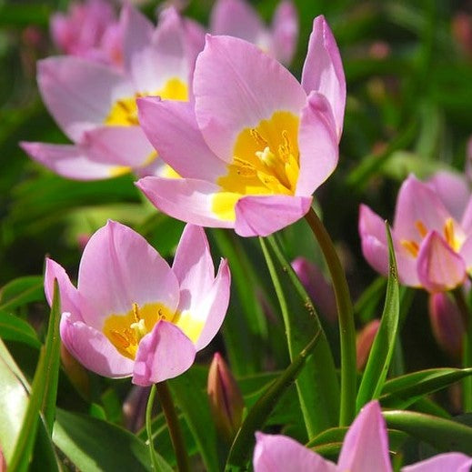This Tulip bears up to three flowers per stem in early May. Flower heads are a soft shade of lilac with a bright sunny yellow centre. It reaches a height of just 15cm, making it the perfect choice for borders, rockeries and pots. You can plant these beside other botanical varieties for a large spread of ground cover, or plant alone in large quantities. The subtle colour and compact habit make them wonderful for planting in clusters or drifts.